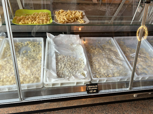 With a quick stop at a Conad supermarket, we took the bus back to our accommodations, hung what needed to be hung, and set off for Pizza at a place a little further away from us. For whatever reason, perhaps the rain-soaked streets that almost devoured a few small cars, they were closed. Therefore, we made the short walk to what was to be a future place to eat, Coccode Pasta all’uovo & Bistro. Here they make many kinds of pasta and also serve it. We ordered two of the specials to share: fried polenta sticks with a gorgonzola and mushroom cream sauce as well as spiral long maccheroni with asparagus and gorgonzola. This was lovingly consumed with a Syrah from Italy. After our meal, but before the bill, we ordered to take away some prepared and dried ravioli with manicotti and spinach inside.