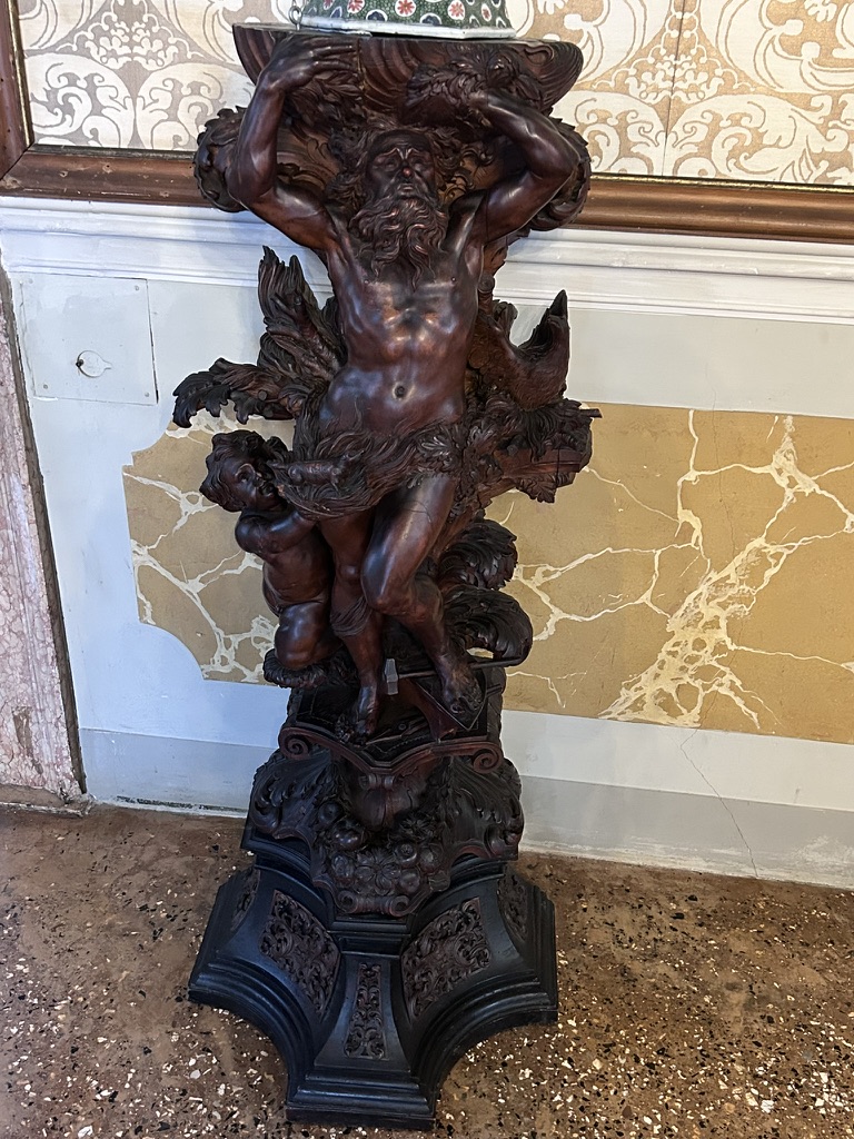 My wanderings near these places brought me to my destination, Ca’Rezzonico Palace. Originally two buildings, they were combined and began to be remodelled, but had to be stopped due to death and lack of funds in the late 1600’s. This became an ongoing theme as a succession of owners and renters turned the building into a revolving door of tenants, after the Rezzonico family line died out in 1810. Notable renters were poet Robert Browning and singer-songwriter Cole Porter. It was bought by the city of Venice in 1935 and turned into a museum of Venetian art within a year. By the way, the cafeteria is reasonably priced and has good sandwiches and coffee.