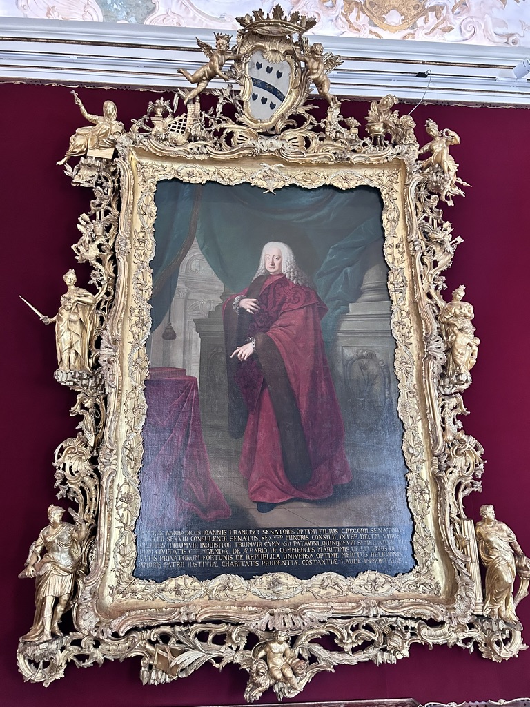 -I love the frame, by an unknown carver, with its intricate detail in painted wood.. The painting is by Bernardino Castelli and is a portrait of Pietro Barbarigo.